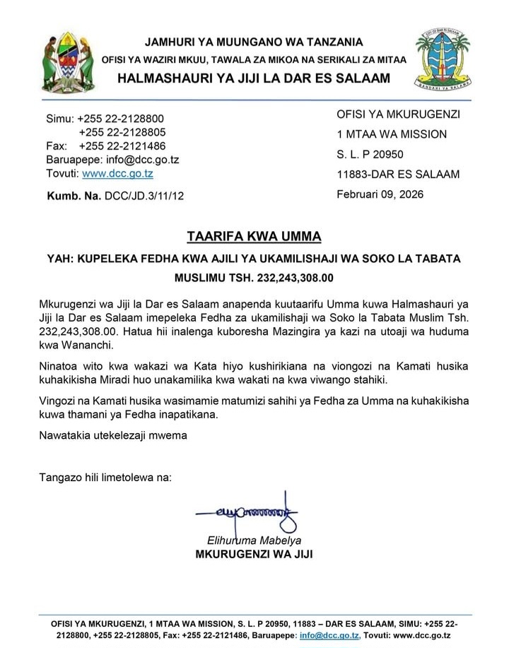 TAARIFA KWA UMMA: KUPELEKWA KWA FEDHA KWA AJILI YA UKAMILISHAJI WA SOKO LA TABATA MUSLIMU